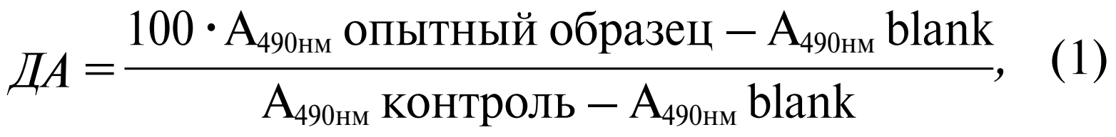 где А490нм – оптическая плотность образца при длине волны 490 нм; blank – культуральная среда, для определения фона культуральной среды.