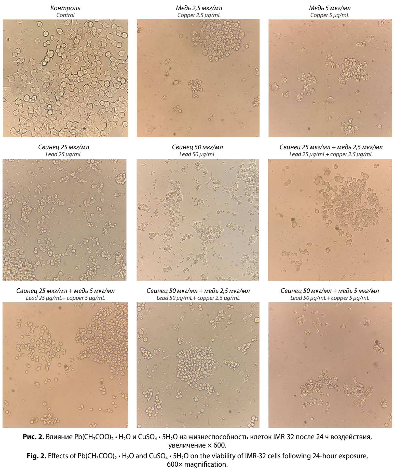 Доказано, что Pb также способен влиять на гомеостаз Cu, повышая её митохондриальную транслокацию и стимулируя рост её концентрации в митохондриях, что также приводит к образованию АФК, повреждению органелл и апоптозу клеток [8]. Данные процессы относятся к факторам возникновения и развития нейродегенеративных патологий, в том числе болезни Альцгеймера и болезни Паркинсона [9, 10]. Тем не менее комбинированное действие Pb и Cu изучено недостаточно. Трудность исследования процессов, лежащих в основе негативных эффектов, вызываемых такой экспозицией, обусловлена сложной природой их взаимодействий. В известной нам мировой литературе имеются лишь единичные работы, посвящённые оценке комбинированной токсичности Pb и Cu, выполненные на экспериментальной модели in vitro [11]. Вместе с тем ни одного исследования, посвящённого оценке комбинированной нейротоксичности свинца и меди, выполненного на специализированных клеточных линиях, в литературе нами обнаружено не было. Таким образом, оценка типологии воздействия соединений свинца и меди с использованием специализированной клеточной культуры (на примере линии IMR-32) является актуальной задачей токсикологических исследований.