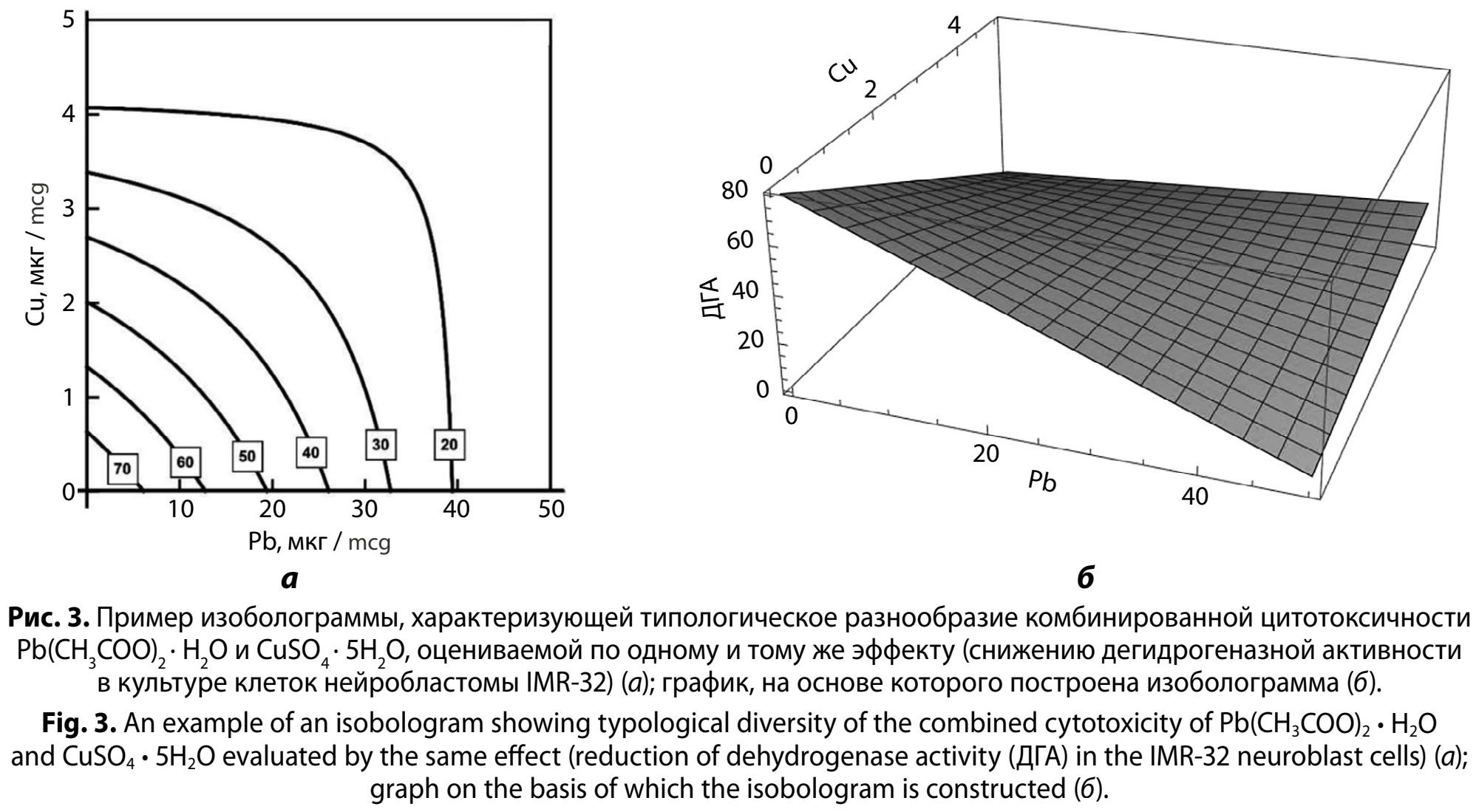 Результаты. Показано, что тип комбинированного действия свинца и меди по показателю дегидрогеназной активности в клетках нейробластомы IMR-32 изменяется с ростом концентраций токсикантов. При малых дозах меди и свинца тип комбинированного действия аддитивный, но с увеличением доз переходит в "антагонизм" становится антагонистическим.