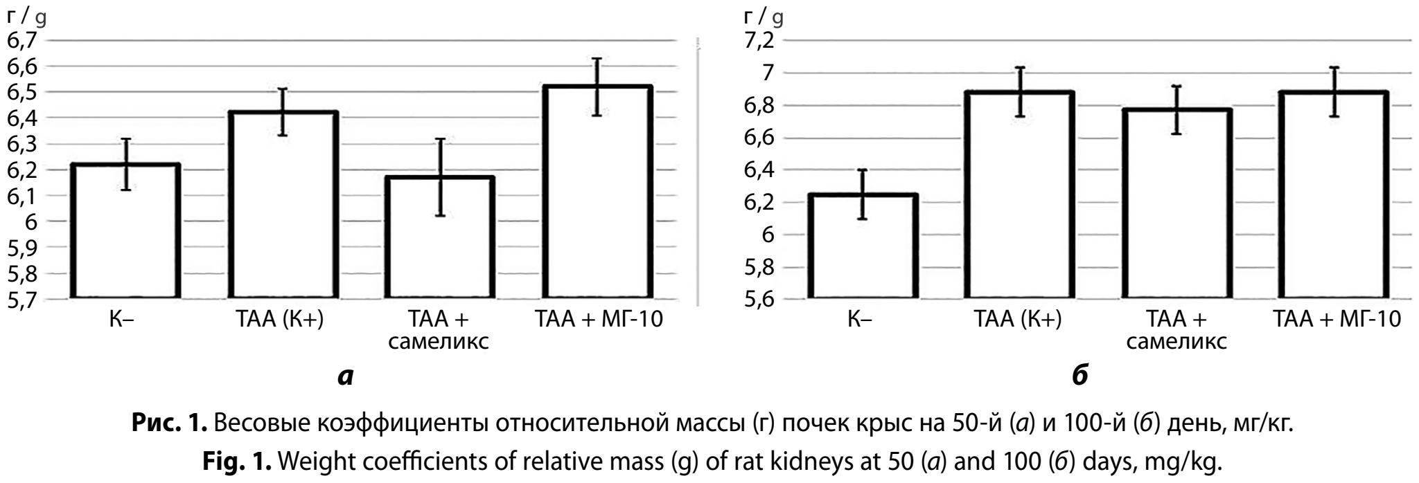 Весовой коэффициент относительной массы почек в группе животных, подвергшихся воздействию ТАА, был выше, чем в группе отрицательного контроля, однако различия не достигли статистической значимости. Коррекция соединением адеметионина и МГ-10 не оказала значительного влияния на снижение относительной массы почек, весовые коэффициенты в этих группах были сопоставимы с таковыми в группе ТАА и не имели значимых отличий.
