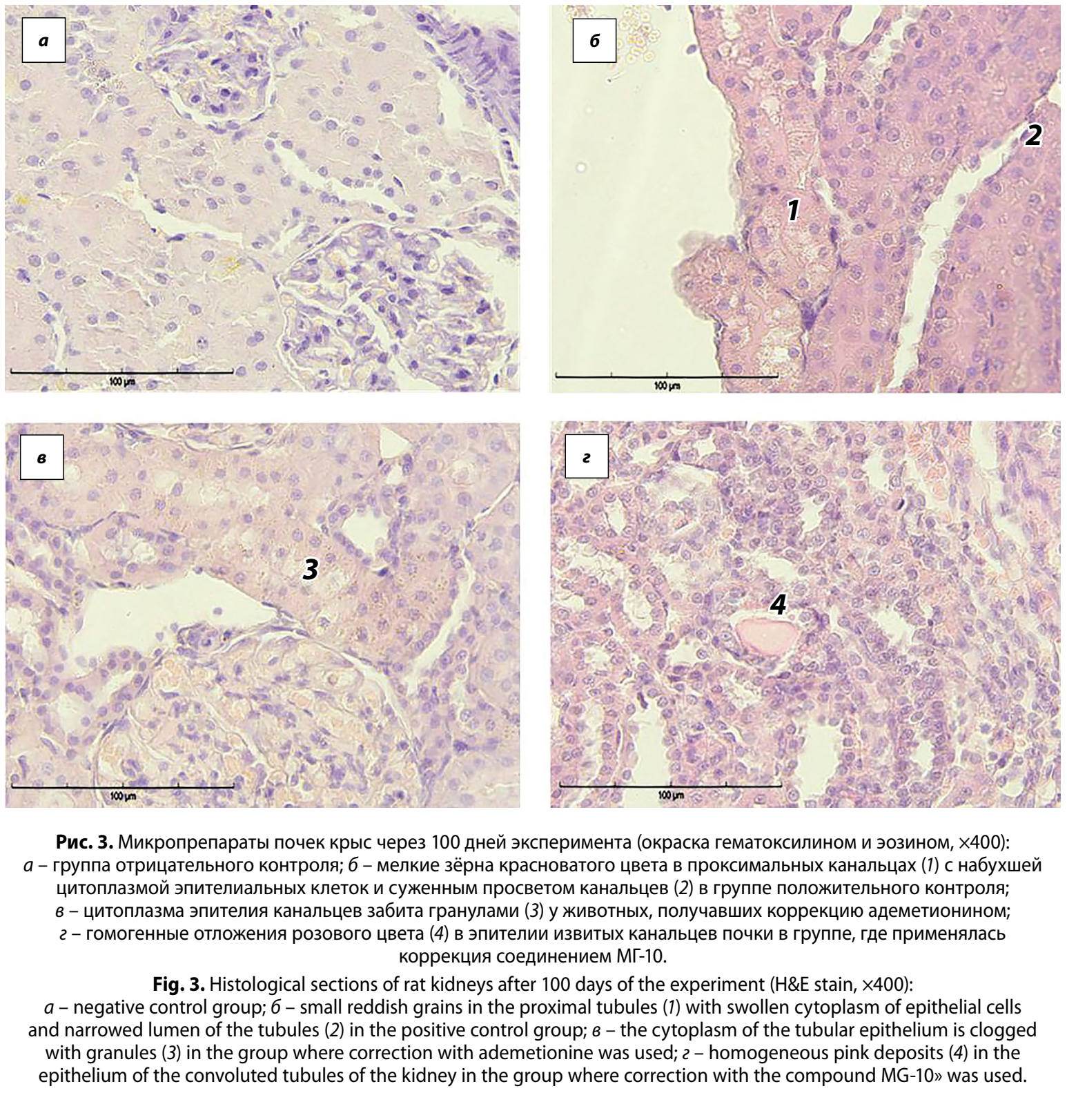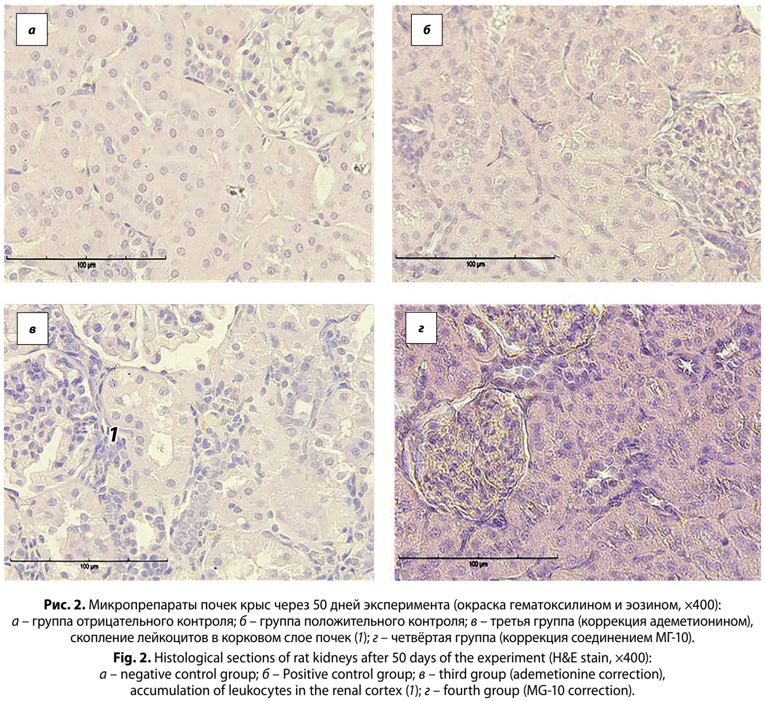 На рис. 2 (см. на вклейке) представлены фотографии микропрепаратов почек крыс на 50-й день эксперимента. В контрольной группе (рис. 2, а, см. на вклейке) структура тканей оставалась без патологических изменений. При введении ТАА (рис. 2, б, см. на вклейке) архитектоника почек не изменялась. В группе, получавшей ТАА и коррекцию адеметионином (рис. 2, в, см. на вклейке), наблюдались незначительные изменения: скопление лейкоцитов и очаговая инфильтрация ткани (обозначено цифрой 1), но без дегенеративных процессов. В группе с воздействием ТАА и коррекцией соединением МГ-10 (рис. 2, г, см. на вклейке) структура почек соответствовала контрольной группе.