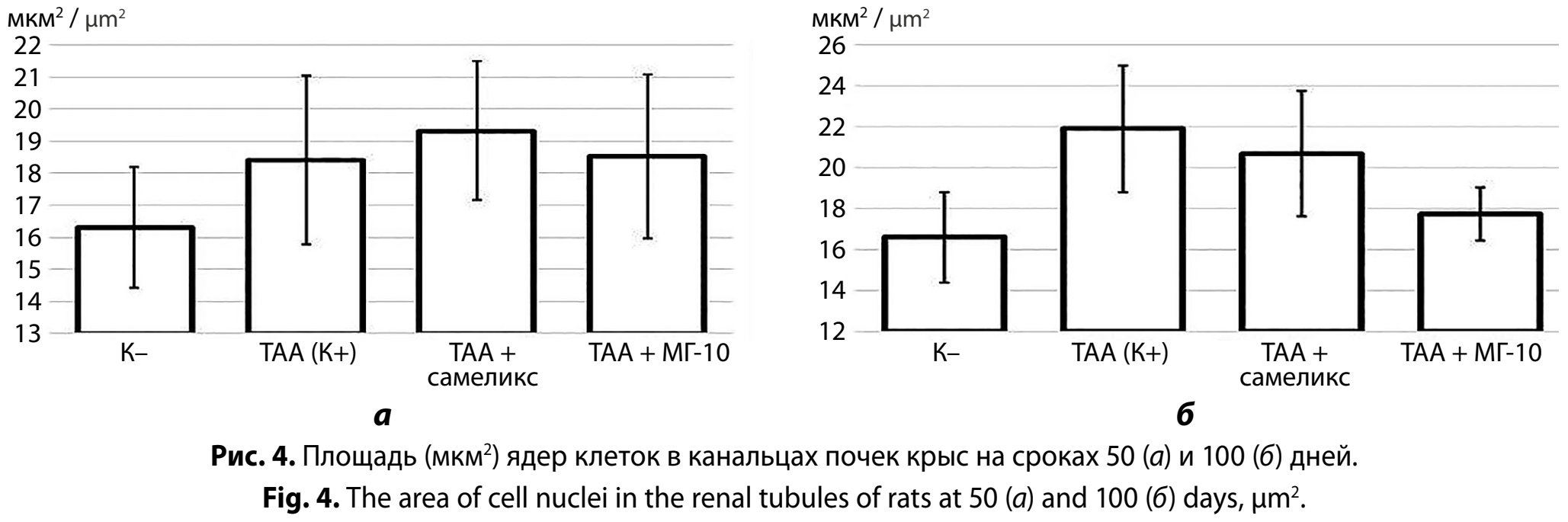 Средние значения весового коэффициента относительной массы (мг/кг) почек крыс на сроках 50 дней и 100 дней представлены на рис. 1, а, б. Между исследуемыми группами и контрольной группой не выявлено статистически значимых различий. Несмотря на видимое увеличение массы почек, различия между отрицательным и положительным контролем не достигли статистической значимости (р = 0,449). Относительная масса почек в четвёртой группе (ТАА + МГ-10) также не отличалась от контрольных значений (р = 0,235). При оценке изменений через 100 дней воздействия выявлено, что увеличение относительной массы почек в группе положительного контроля по сравнению с 50-дневным воздействием не достигло статистической значимости относительно отрицательного контроля (р = 0,095). В то же время в четвёртой группе показатель был значимо выше (р = 0,048). В остальных случаях статистически значимые различия между группами не выявлены.