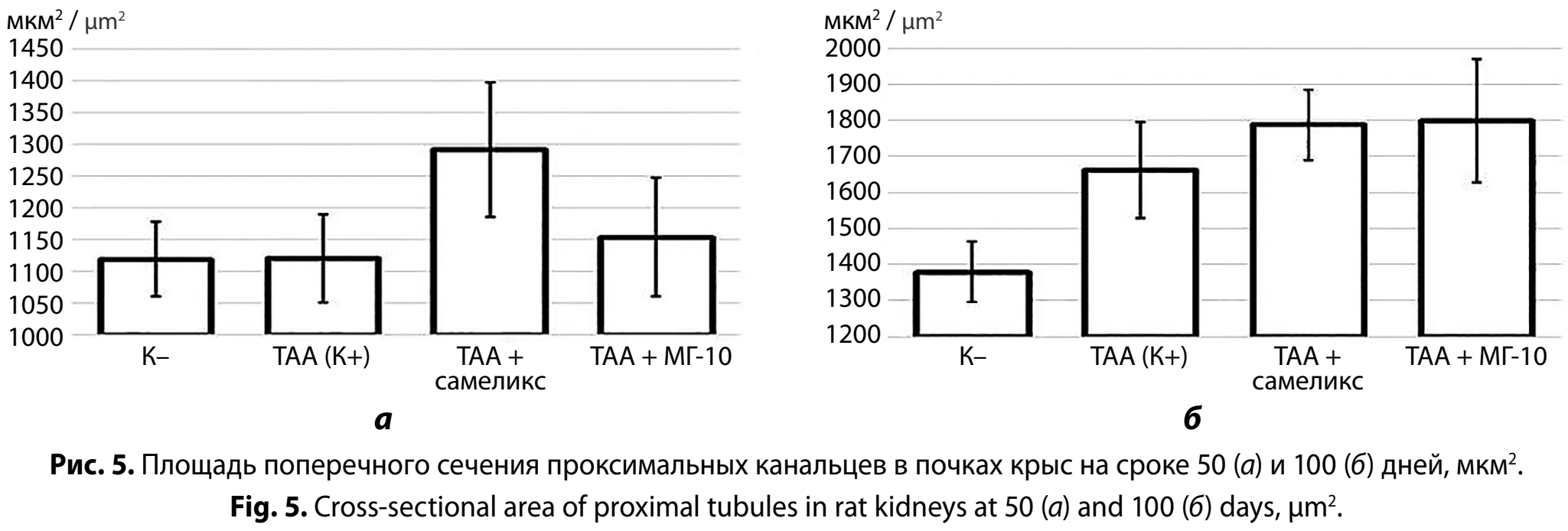 Результаты морфометрического анализа площади поперечного сечения канальцев почек (мкм) через 50 и 100 дней воздействия представлены на рис. 5, а, б. Несмотря на выраженную тенденцию к увеличению изучаемого параметра в третьей группе по сравнению с отрицательным контролем, различия не были статистически значимыми (р = 0,702). Различия между положительным и отрицательным контролями также не достигли статистической значимости (р = 1,000), как и в четвёртой группе (р = 1,000). Через 100 дней воздействия была зафиксирована статистически значимая разница между третьей группой (ТАА + «Самеликс») и отрицательным контролем (р = 0,039), однако различия с четвёртой группой (р = 0,269) и положительным контролем (р = 0,467) не были значимыми. В других сравнениях статистически значимых различий не выявлено.