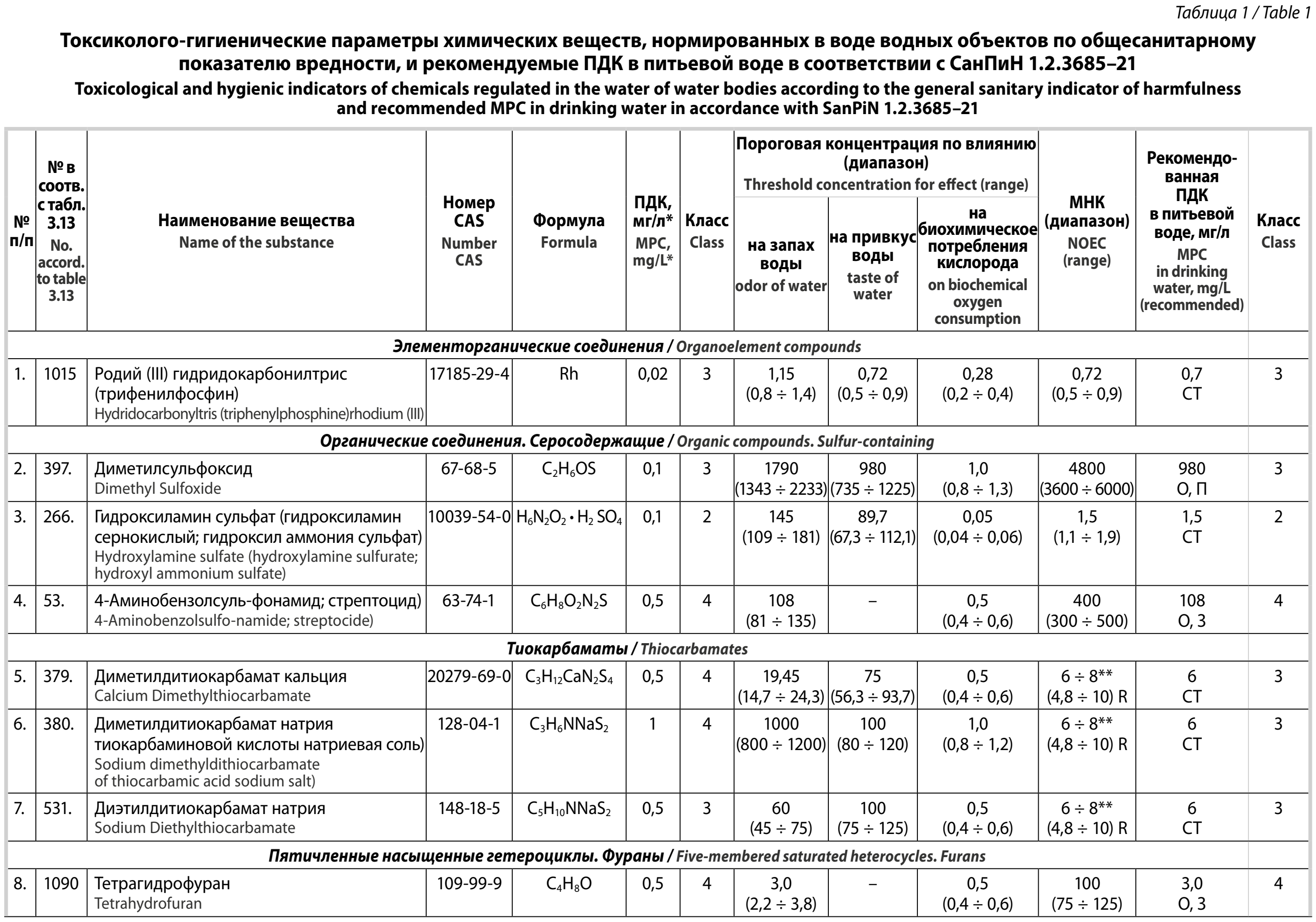 На первом этапе работы из списка химических веществ, включенных в СанПиН 1.2.3685–21³ и нормированных в воде по общесанитарному показателю вредности (всего 204 вещества), выделили группу веществ, для которых имеются данные о пороговых концентрациях по органолептическому показателю вредности (ПКорг), влиянию на процессы самоочищения воды водных объектов (ПКсан), и архивные материалы по токсикологическим параметрам: LD50, максимальные недействующие дозы (МНД) и концентрации (МНК) по санитарно-токсикологическому показателю вредности в базе данных WATERTOX⁴. Для удобства представления информации и анализа данных вещества разбили по химическим классам – всего 23 вещества (табл. 1).