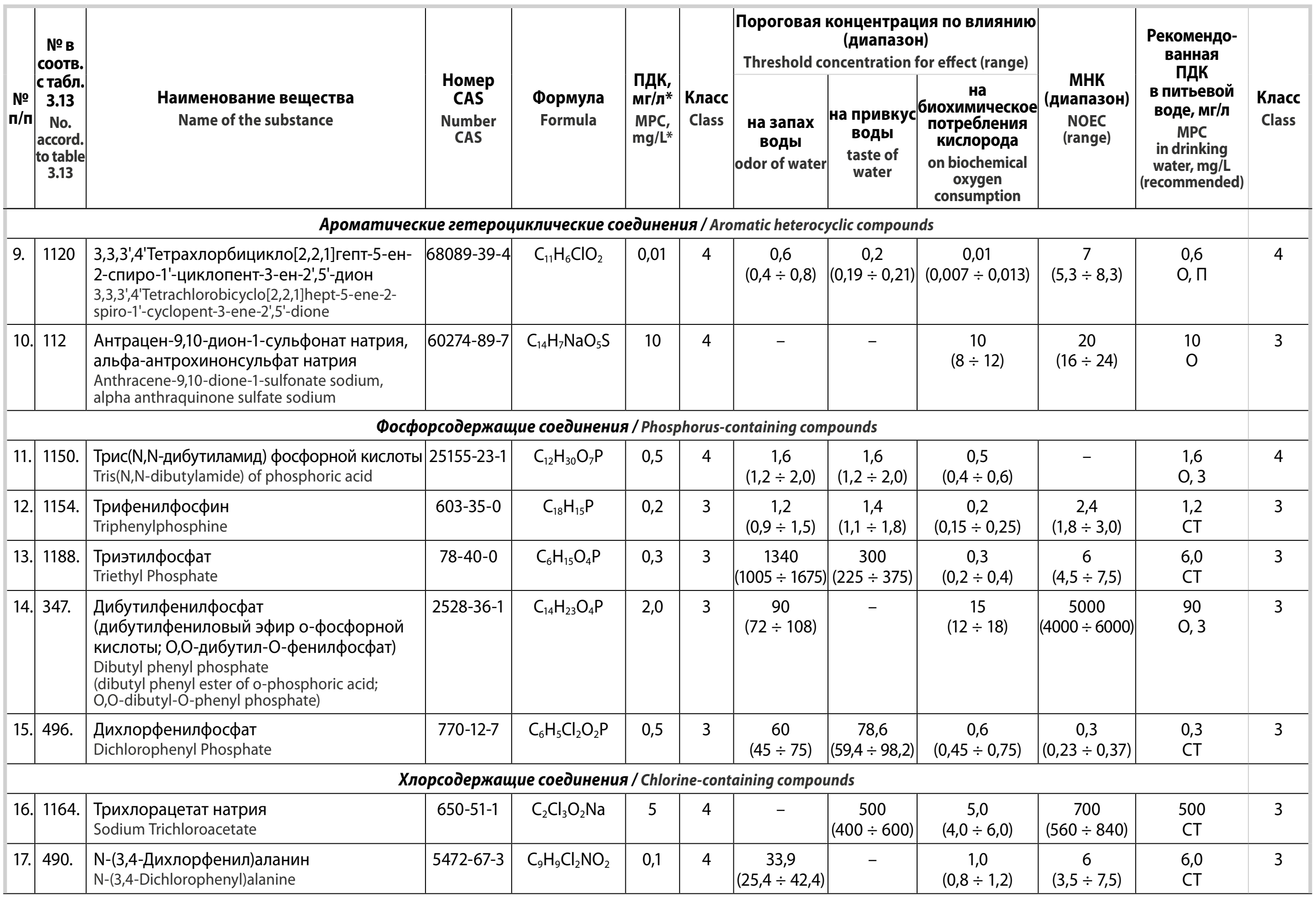 Кроме того, МНК дихлорфенилфосфата (CAS № 770-12-7) составляет 0,3 мг/л, что ниже пороговой концентрации по влиянию на процессы самоочищения водных объектов, однако ПДК этого вещества обоснована на уровне 0,5 мг/л, общесанитарный показатель вредности, 3-й класс опасности в соответствии с СанПиН 1.2.3685–213. Исследования по обоснованию гигиенического норматива дихлорфенилфосфата проведены в 1968 г., и в архивных материалах отсутствует информации об условиях токсикологического эксперимента. Возможно, потребуется корректировка не только лимитирующего показателя вредности, но и ПДК этого вещества.