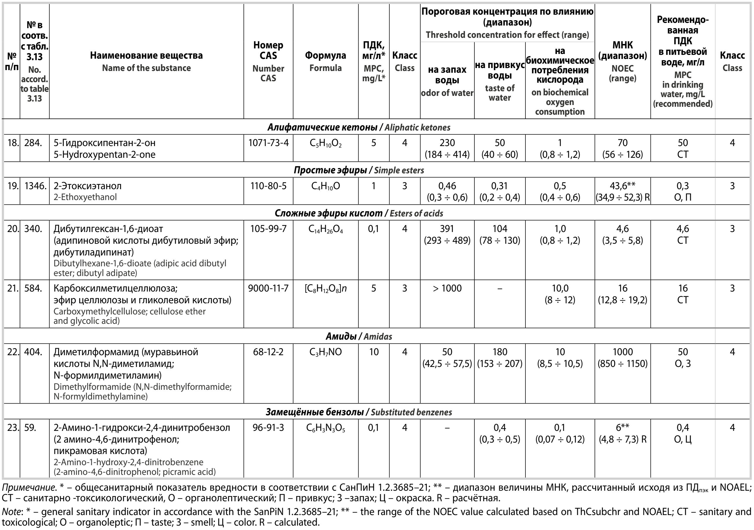 При анализе массива данных 23 веществ обнаружили техническую ошибку, допущенную при составлении перечня веществ: в табл. 3.13 СанПиН 1.2.3685–21³ ПДК 2-этоксиэтанола (CAS № 110-80-5) указана на уровне 1 мг/л, в то время как в ГН 2.1.5.1315–03¹² она составляла 0,3 мг/л.