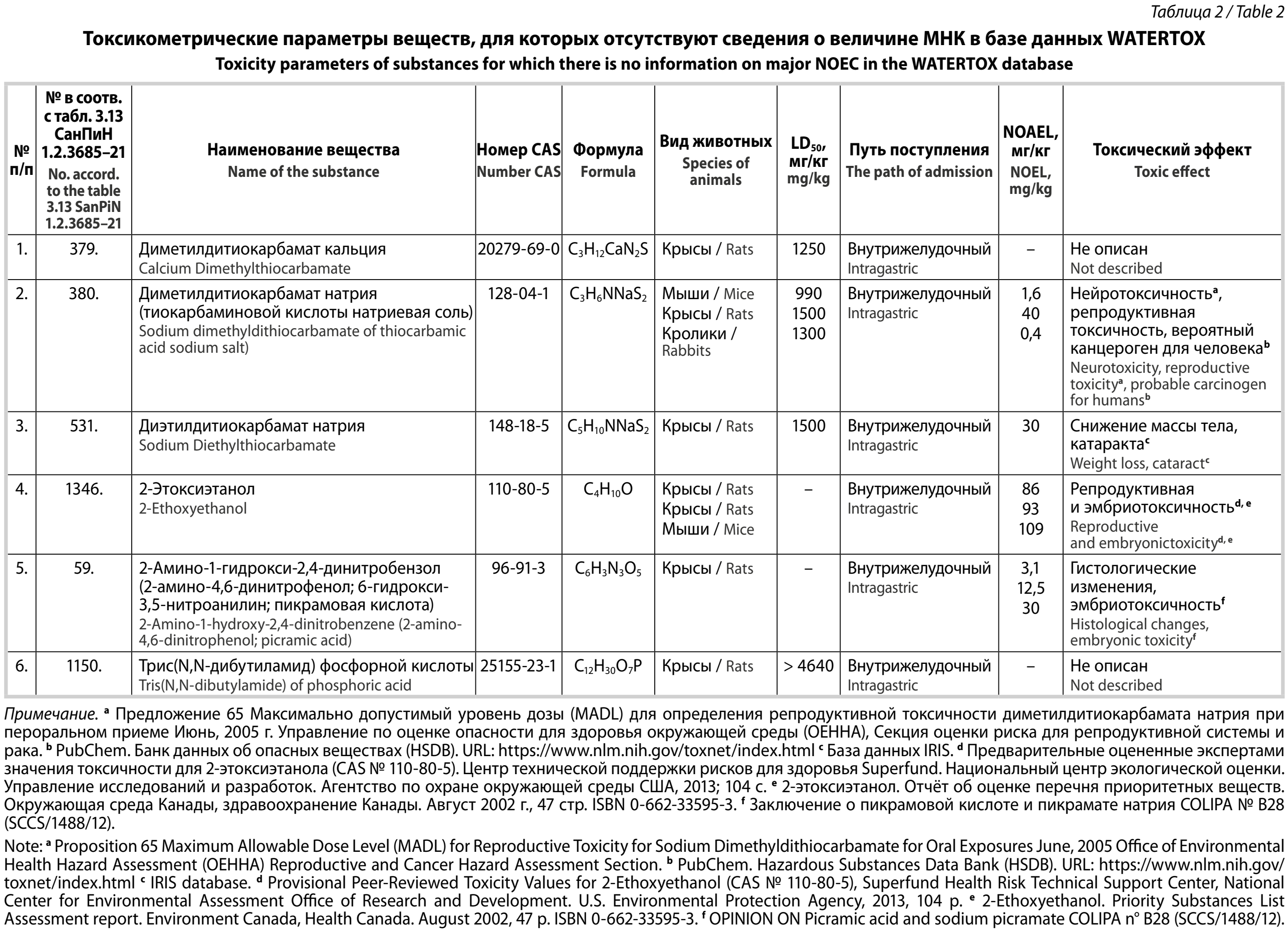 В результате обработки архивной информации установили, что для шести веществ отсутствуют величины МНК по санитарно-токсикологическому показателю вредности, установленные в соответствии с МУ 2.1.5.720–98¹. В связи с этим провели поиск в базе данных Федерального регистра потенциально опасных химических и биологических веществ. В табл. 2 систематизированы токсиколого-гигиенические параметры данных веществ: среднесмертельная доза LD50, пути поступления в организм разных видов животных, величины NOAEL (уровень отсутствия наблюдаемого вредного эффекта) и NOEL (уровень отсутствия наблюдаемого эффекта), основные токсические эффекты воздействия.