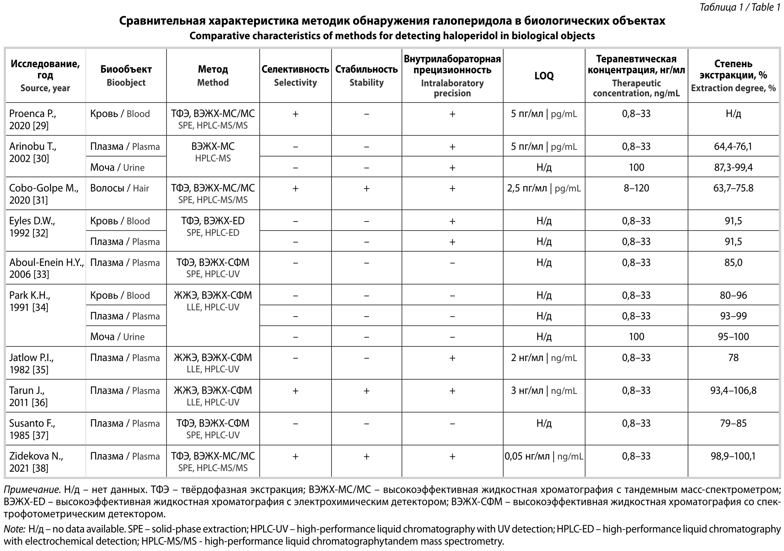 Показано, что только методики с обычным и тандемным масс-селективным детектированием (1–3, 10) позволяют количественно определять галоперидол во всём терапевтическом диапазоне. Для методики 1 не определён процент экстракции, что говорит о недостаточной разработке методики. Методика 2 удовлетворяет по отношению LOQ (Limit of Quantification – предел количественного определения) к терапевтической концентрации для плазмы, хоть и имеет низкую степень экстракции, однако в публикации отсутствуют данные о LOQ для исследования мочи. Методика 3 также демонстрирует невысокие показатели степени экстракции для галоперидола в широком диапазоне, а методика 10 разработана только для плазмы. В отношении методик 4, 5, 6, 9 можно заключить, что они не удовлетворяют вышеуказанным требованиям. Методики 7 и 8 являются схожими: разница в степенях экстракции связана, вероятно, с выбором экстрагента – гексана с добавлением 2% изоамилового спирта и подщелачиванием гидроксидом натрия в методике 7, изопропанола без влияния на pH среды – в методике 8.