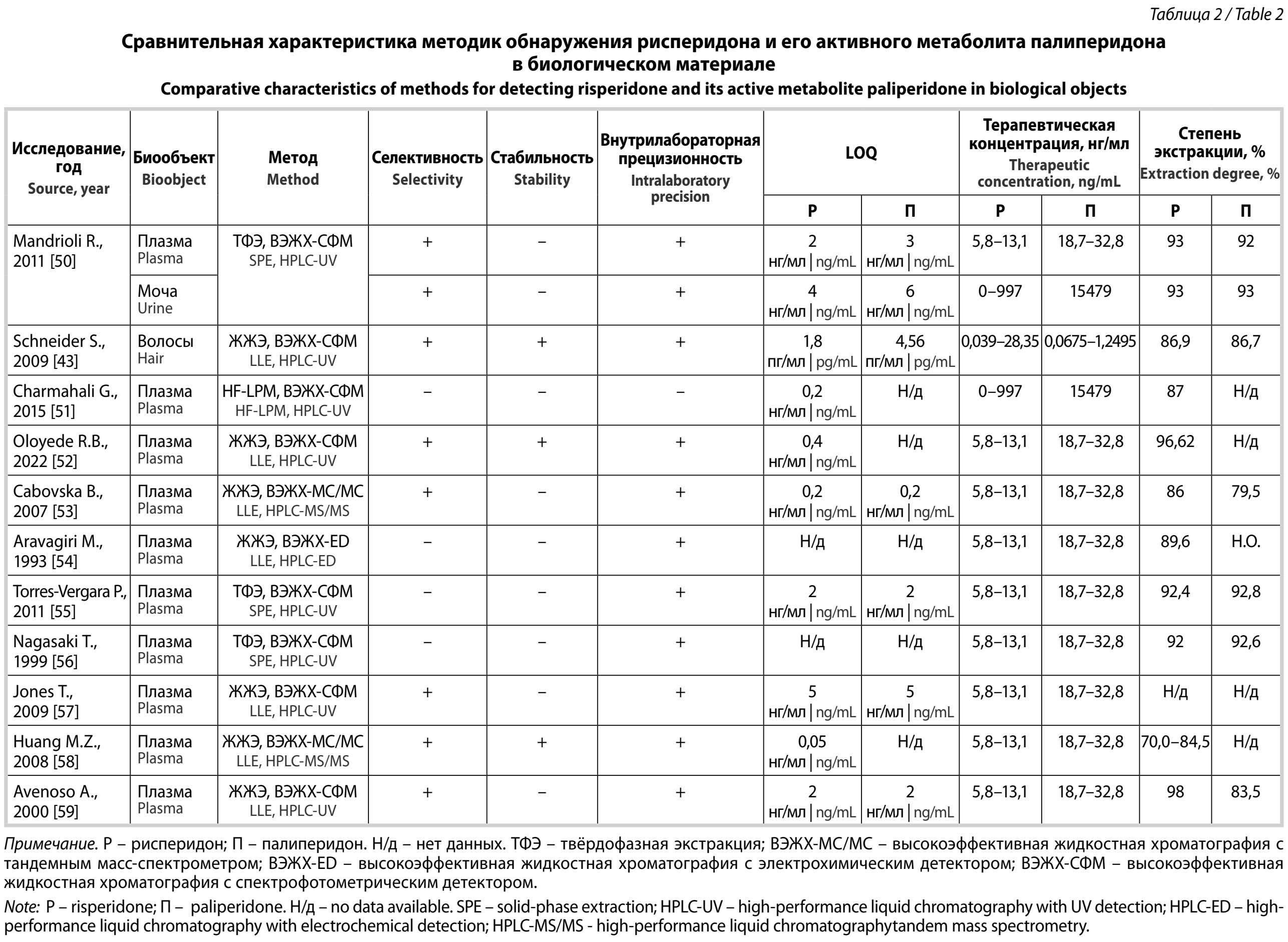 Методики определения рисперидона и его активного метаболита палиперидона в биологических объектах представлены в табл. 2.