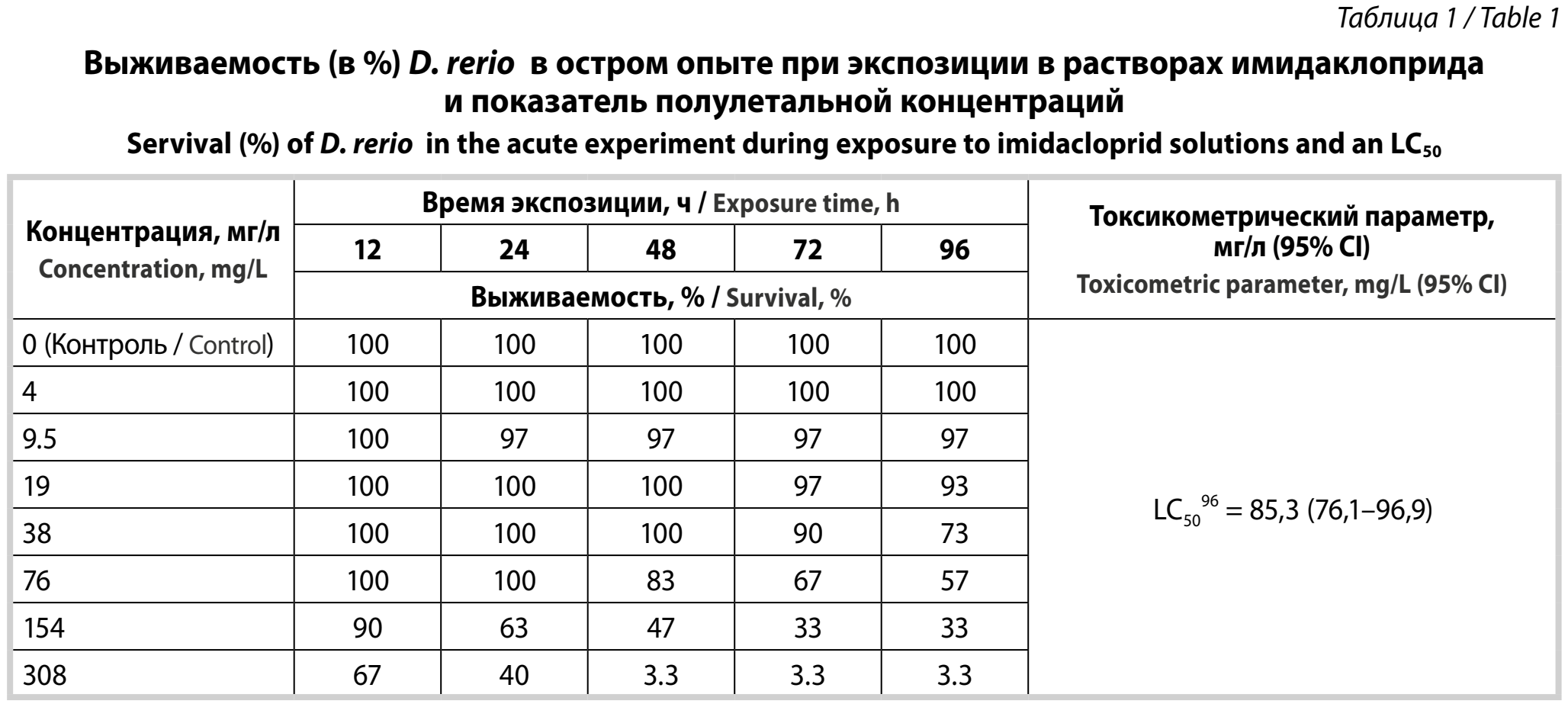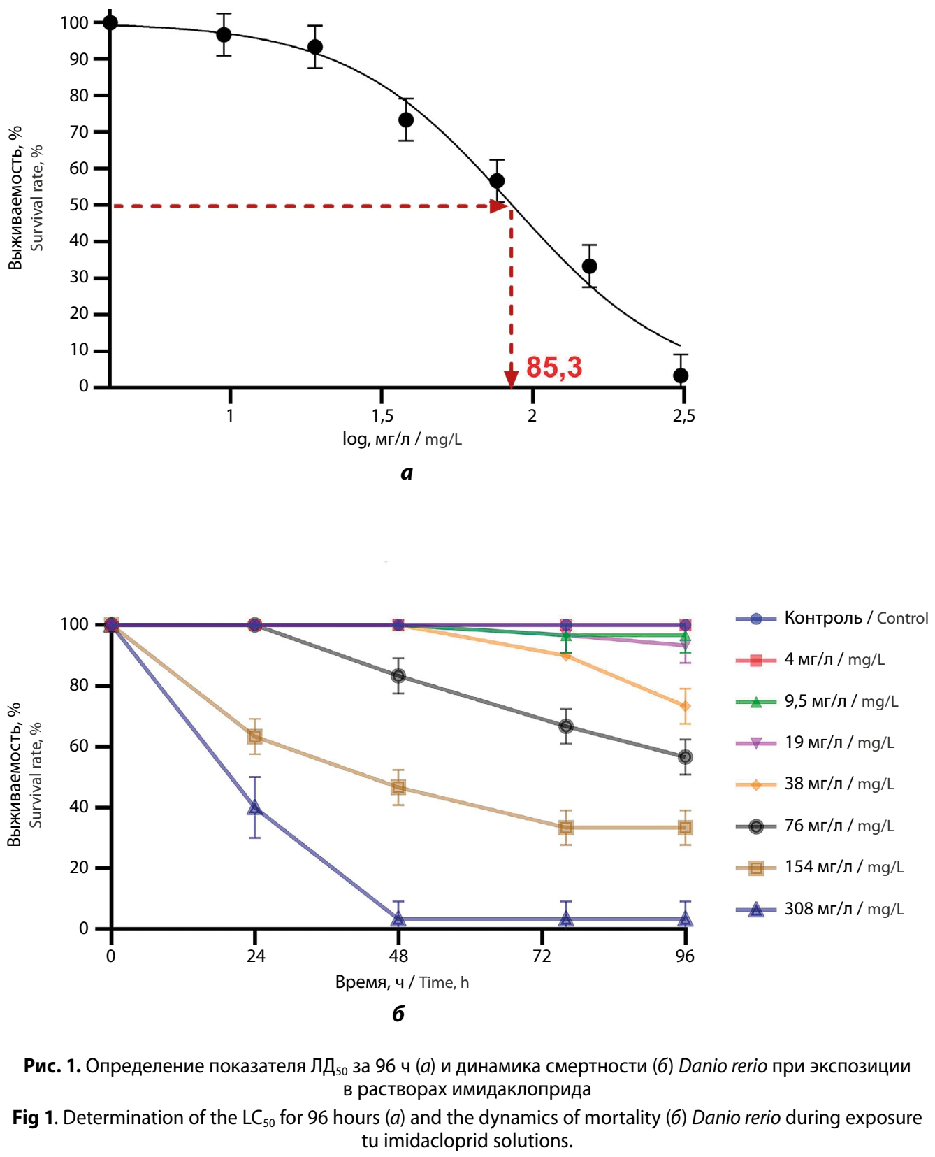 По результатам острого опыта в широком спектре концентраций имидаклоприда полулетальная концентрация для взрослых особей D. rerio составила 85,3 мг/л при доверительном интервале (CI) 76,1–96,9 (рис. 1, а, см. на вклейке).
