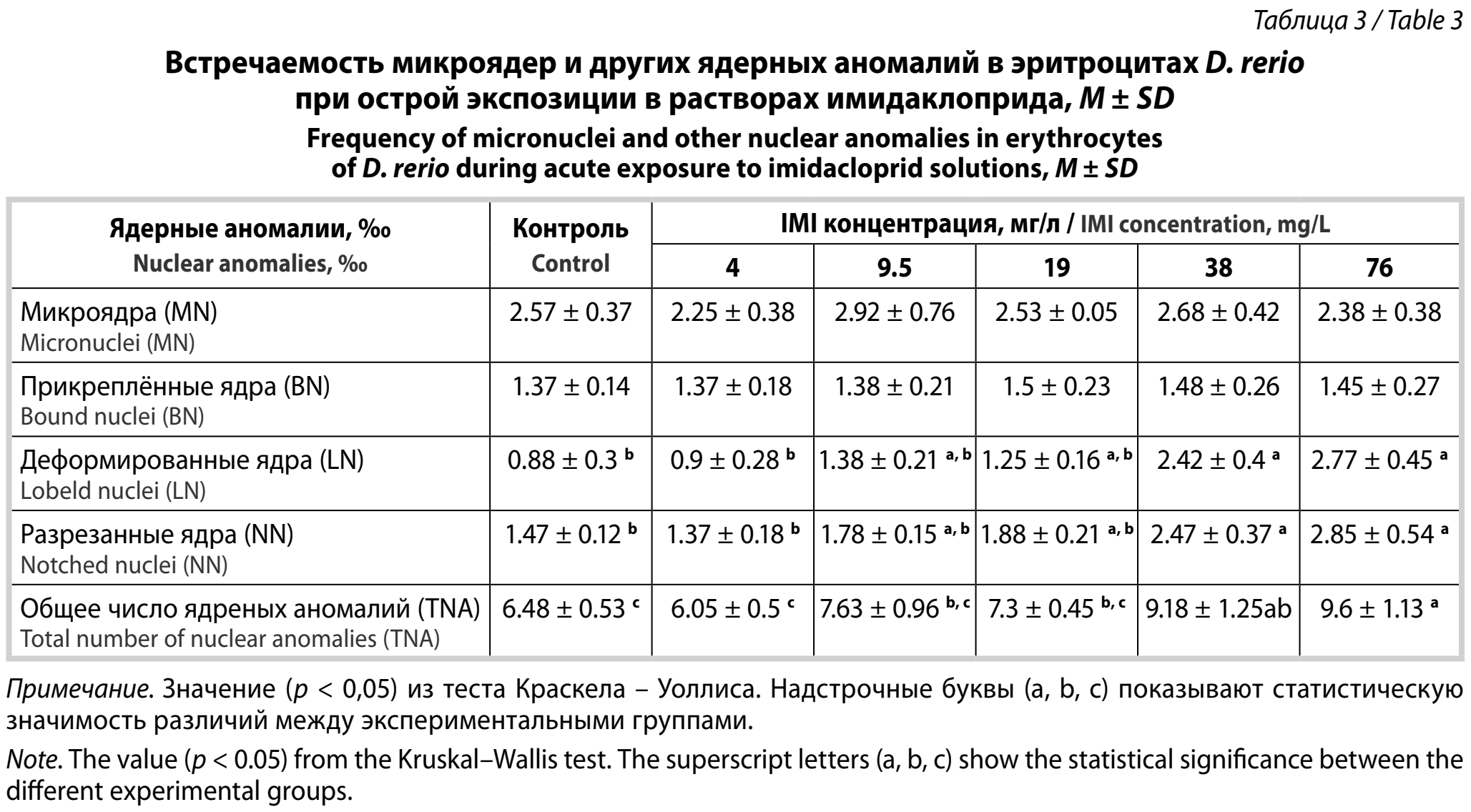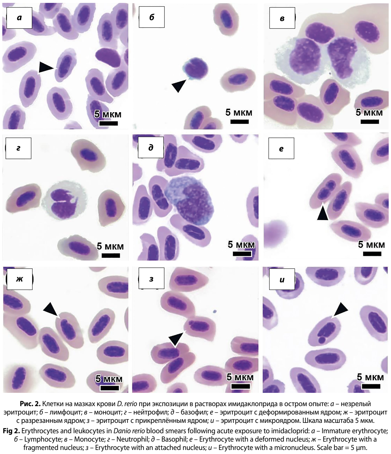 Для определения летальных и сублетальных концентраций имидаклоприда (IMI) использовали показатель ЛК50 за 96 ч. Исследования производили согласно методике OECD Test no. 203 с некоторыми модификациями. Имидаклоприд (N-{1-[(6-хлор-3-пиридил)метил]-4,5-дигидроимидазол-2-ил}нитрамидел; CAS no. 138261-41-3) был приобретён у Chemenu Inc. (Shanghai, Китай). Диапазон номинальных концентраций для острого опыта подбирали исходя из литературных данных: 4; 9,5; 19; 38; 76; 154 и 308 мг/л [12]. Имидаклоприд обладает высокой растворимостью в воде и не требует применения растворителей. По данным литературы, имидаклоприд устойчив в водной среде [3, 4] при указанных сроках опыта (4 сут). Опыты для каждой экспериментальной группы (всего 8 групп) проводились в трёхкратной повторности в аквариумах объёмом 50 л, в которые помещали по 20 особей D. rerio (n = 20 × 3). Гидрохимические условия в опытных аквариумах на начало острого опыта соответствовали аквариумам содержания. На протяжении опыта контролировали изменения в поведении, клинические признаки и смертность рыб. После завершения опыта из растворов с концентрацией ниже ЛК50 за 96 ч (76 мг/л и далее) из каждой группы отбирали по шесть особей для забора крови (n = 6). Перед отбором биологического материала рыба анестезировалась в растворе MS-222 (20 мг/л) в течение трёх минут. Забор крови для приготовления препаратов периферической крови производился из задней полой вены согласно ранее описанной методике [15]. Количество эритроцитов в крови определяли по методам, описанным P.C. Blaxhall и K.W. Daisley [16]. Приготовленные препараты окрашивали по May – Grünwald – Giemsa, на готовых мазках выполняли подсчёт эритроцитов и их незрелых форм, лимфоцитов, моноцитов, нейтрофилов, базофилов и тромбоцитов. Минимальное количество просмотренных клеточных элементов на одном препарате составляло не менее 10 000. На приготовленных препаратах периферической крови рыб производили подсчёт эритроцитов, обладающих выраженными нарушениями, согласно методикам, приведённым в работах E. Bagdonas и соавт., M.Z. Vosylienė и соавт. [17, 18]. Наряду с микроядрами (micro nuclei, MN) учитывали следующие аномалии: разрезанное ядро (notched nuclei, NN), деформированное ядро (lobbed nuclei, LN) и прикреплённое ядро (blebed nuclei, BN). Выявление нескольких типов ядерных аномалий позволяет повысить достоверность оценки генотоксичности [15]. Для точного определения микроядер и других ядерных аномалий использовали ряд отличительных характеристик: одинаковая морфология ядра и микроядра, малая удалённость от ядра, размер от 1/16 до 1/3 ядра, минимальное отличие по цвету от ядра [19]. Минимальное количество просмотренных эритроцитов на одном препарате составляло не менее 8 000 клеток. Для изготовления гистологических срезов из каждой группы отбирали по четыре особи, из которых изготавливали по три серийных тотальных среза во фронтальной плоскости. Приготовление и окраску гистологических препаратов выполняли согласно общепринятой методике S.K. Suvarna и соавт. [20]. Образцы промывали в проточной воде и проводили через ряд последовательно возрастающих концентраций этанола (70% – 1 ч, 80% – 1 ч, 95% – 1 ч и 99% – два раза по 1 ч) (Citadel 2000, Thermo FS, США). После этого образцы просветляли в ксилоле в течение 1,5 ч и выполняли заливку в парафин. Микротомные срезы (Minux S700A, RWD Life Science, Китай) толщиной 4 мкм окрашивали гематоксилином и эозином (H&E). Полученные препараты просматривали под световым микроскопом