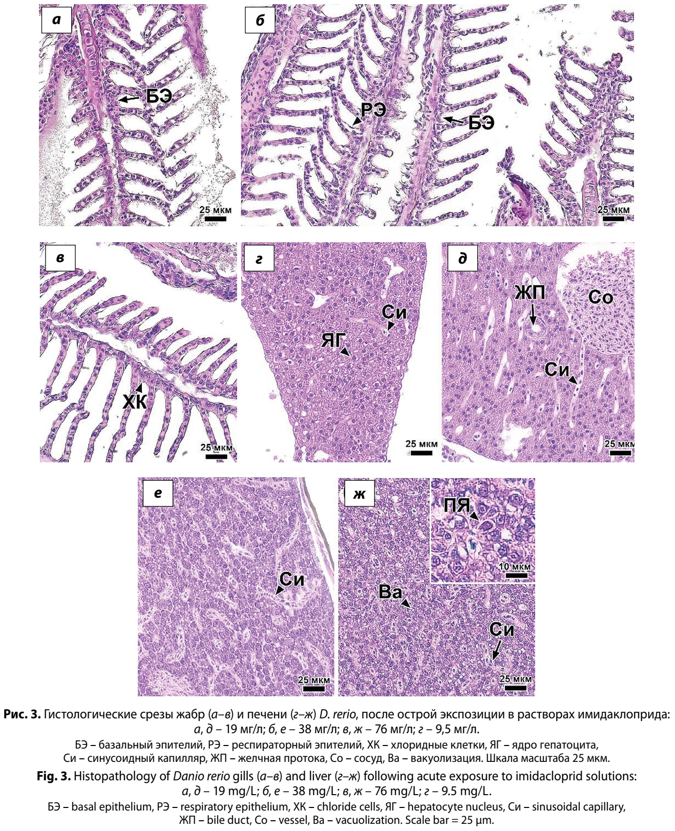 Заключение. Полученные данные демонстрируют системное токсическое действие имидаклоприда в концентрациях более 19 мг/л на органы и ткани D. rerio.