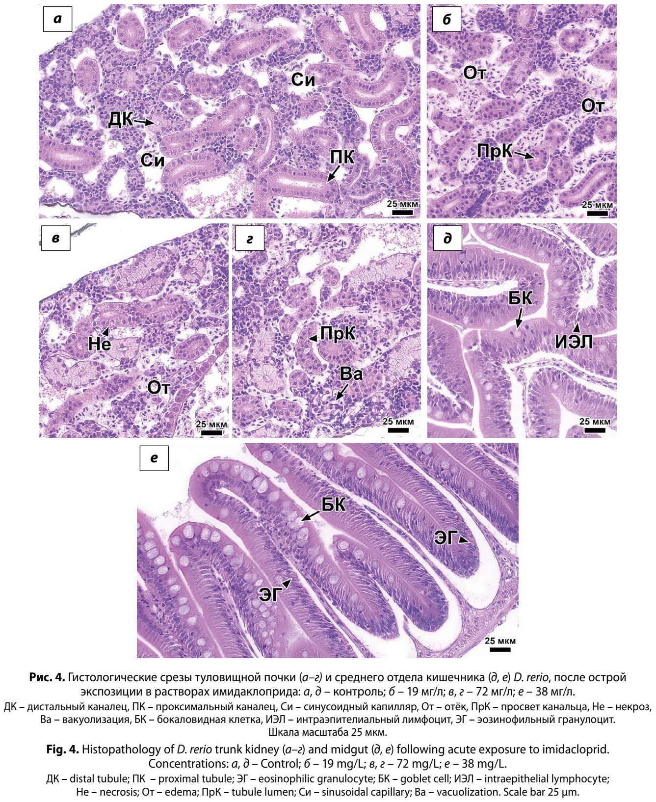 Нейроактивный инсектицид класса неоникотиноидов имидаклоприд активно применяется во всем мире для борьбы с различными насекомыми-вредителями [3, 4]. Высокая растворимость имидаклоприда в воде обусловливает его миграцию в поверхностные и грунтовые воды, аккумуляцию в водных экосистемах и, как следствие, потенциальную угрозу для гидробионтов. Было продемонстрировано, что имидаклоприд может оказывать иммунотоксическое [5], нейротоксическое [6] и мутагенное [3, 7] действие на млекопитающих и гидробионтов [8, 9]. Несмотря на значительный объём исследований, посвящённых оценке острой и хронической токсичности имидаклоприда для водных организмов, данные о подострой токсичности, индуцированной сублетальными концентрациями, и динамике развития патологических изменений у рыб остаются фрагментарными. Для системного понимания механизмов действия поллютантов необходимо комплексное изучение как краткосрочных эффектов, вызываемых высокими концентрациями, так и отдалённых последствий воздействия низких концентраций [10]. Рыбы D. rerio широко используются как модельный объект в токсикологических, фармакологических и биомедицинских исследованиях. Ряд исследований на D. rerio продемонстрировал негативное влияние имидаклоприда на репродуктивную функцию [11], поведение [12] и нейрохимические процессы [6]. Однако данные о влиянии этого пестицида, особенно в отношении системных гистопатологических изменений, остаются неполными. Гистологический анализ как важный инструмент токсикологических и экотоксикологических исследований на рыбах позволяет охарактеризовать патологический процесс и оценить потенциальные долгосрочные последствия воздействия [13]. Важно указать, что токсическое действие поллютантов может проявляться как в виде поражений отдельных органов-мишеней, так и в развитии системных нарушений, что зависит от концентрации и пути поступления в организм.