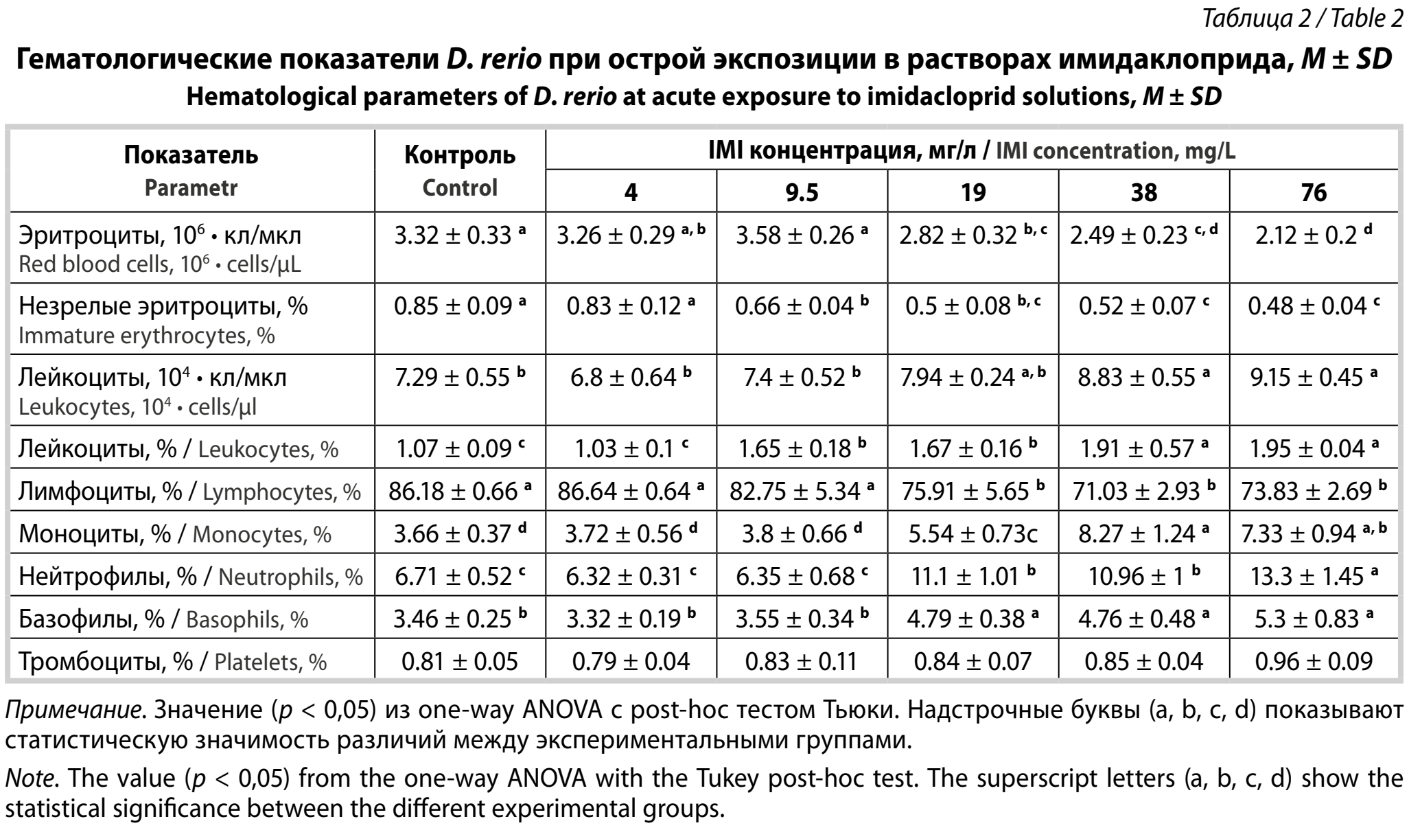 - Имидаклоприд в концентрациях ≥ 19 мг/л вызывает значимые изменения гематологических показателей D. rerio: снижение числа эритроцитов, лейкоцитоз, относительную лимфопению и увеличение числа моноцитов, нейтрофилов и базофилов.