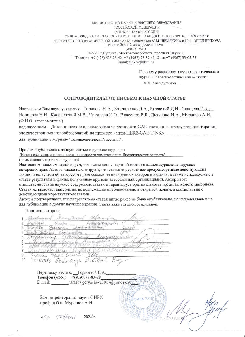 Горячева Н.А. Доклинические исследования токсичности CAR-клеточных продуктов для терапии злокачественных новообразований на примере «анти-HER2-CAR-T/ CAR-NK». Токсикологический вестник. 2022;30(6).